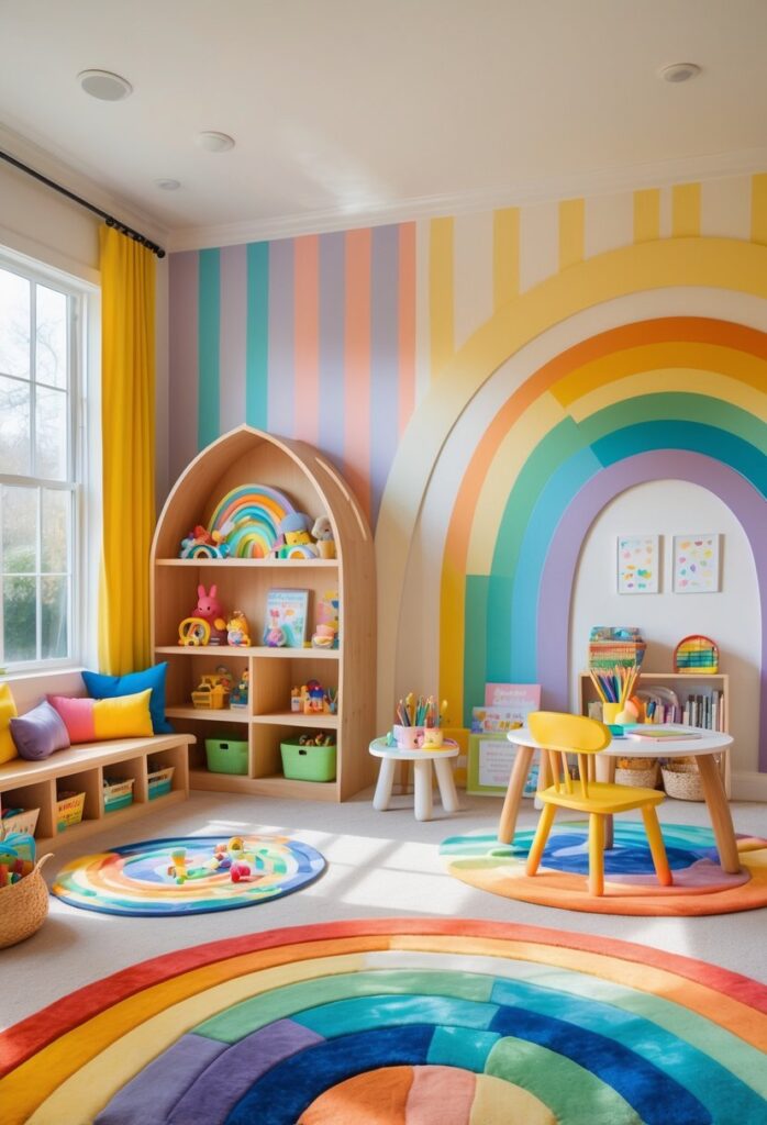 Using different textures along with colors creates a playful atmosphere. Interactive toys and colorful mats complete the look while supporting imaginative play. For more ideas, see rainbow kids room inspirations.