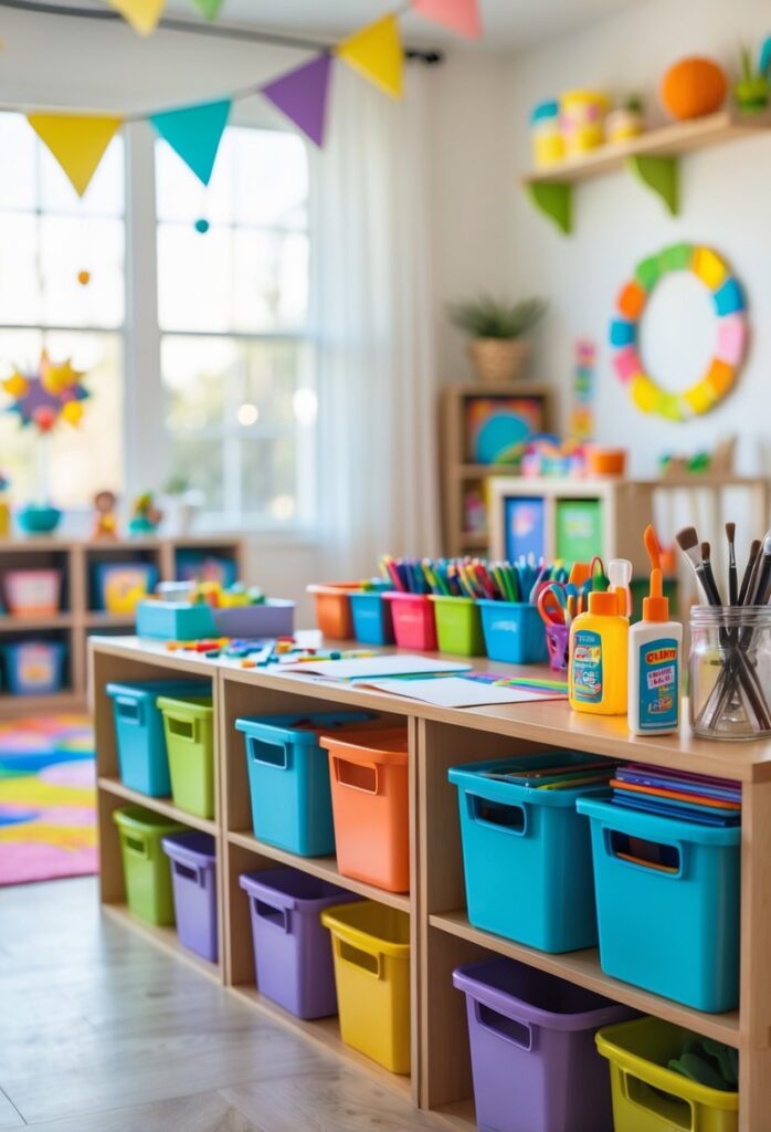 A craft station with storage bins helps keep supplies neat and easy to find. Bins make it simple to sort materials by type, like crayons, paper, or glue.