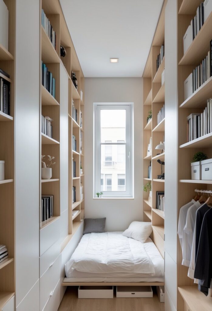 This creates extra room to move and makes the space feel less crowded. Shelves can hold books, decor, or personal items.