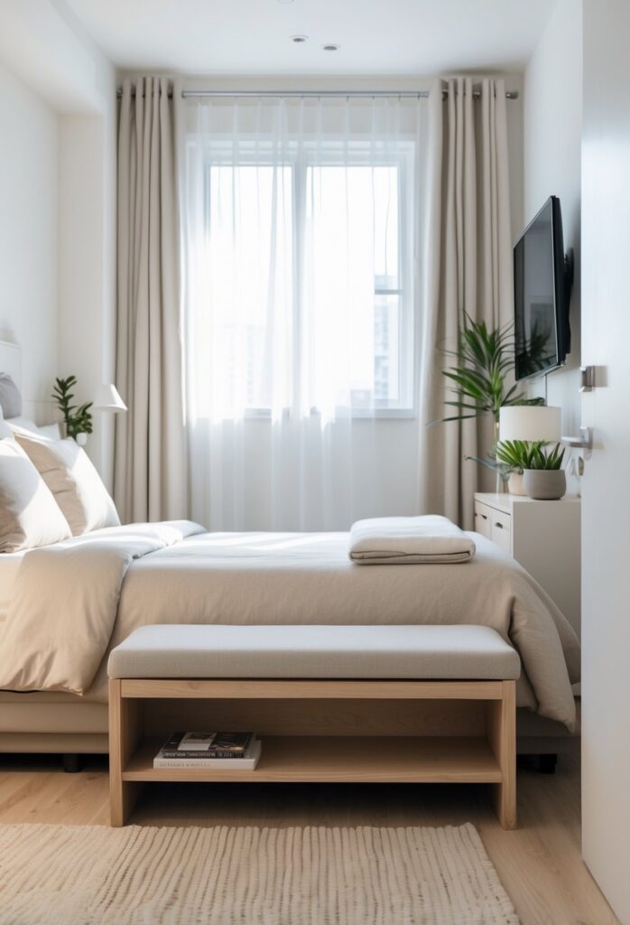 Using multifunctional furniture like this bench helps maximize small bedrooms by combining useful features in one compact design. It makes the space more practical and organized.