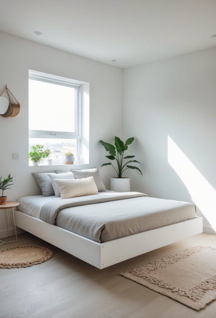A floating bed frame lifts the bed off the floor, creating visible open space beneath. This design makes the room feel less crowded.