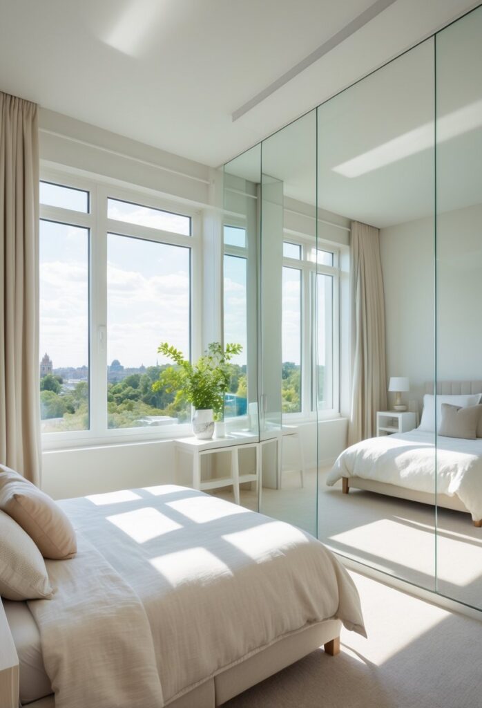 Floor-to-ceiling mirrors help make small bedrooms feel larger by reflecting light across the room. They brighten dark corners and deepen the space visually.