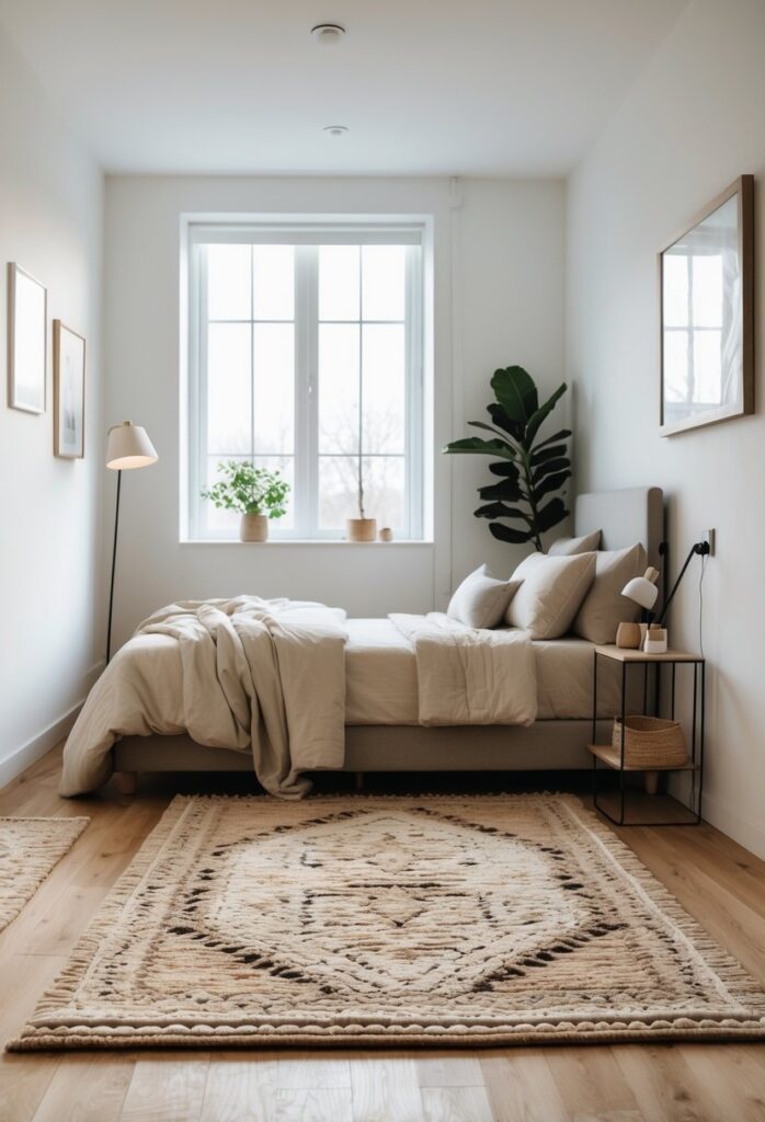 A wall-to-wall rug can help create a seamless look in a small bedroom. It covers the entire floor, making the space feel more connected and less cluttered.