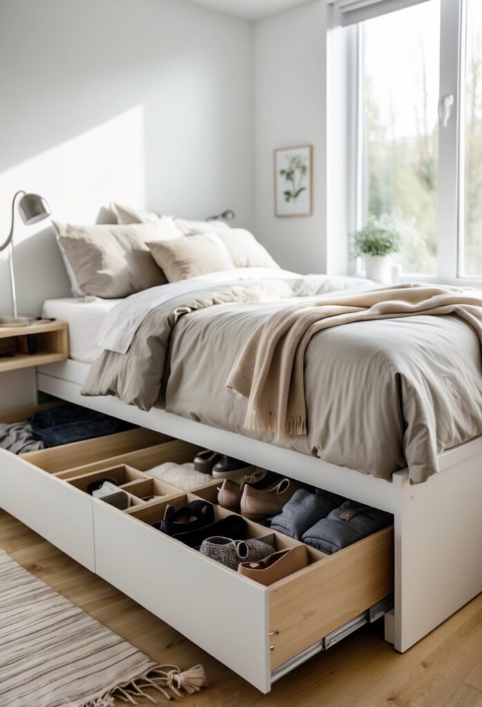 Under-bed storage drawers help use space that often goes unused. They keep items like clothes and shoes neatly tucked away.