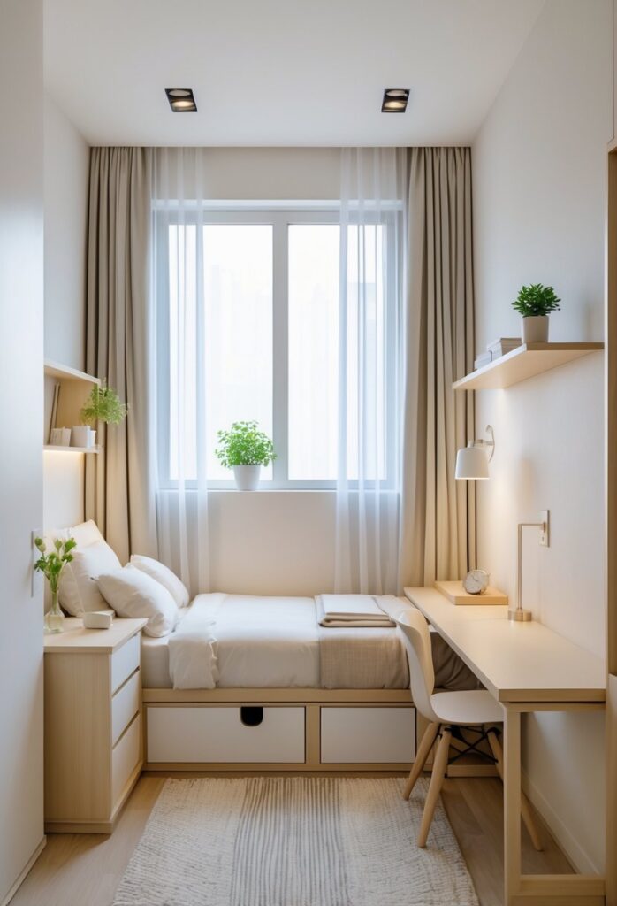 Placing furniture to maximize floor space is critical. The bed is often the largest piece, so positioning it against the longest wall or in a corner can free up room for movement. Using floating shelves or wall-mounted nightstands instead of bulky furniture saves valuable space.