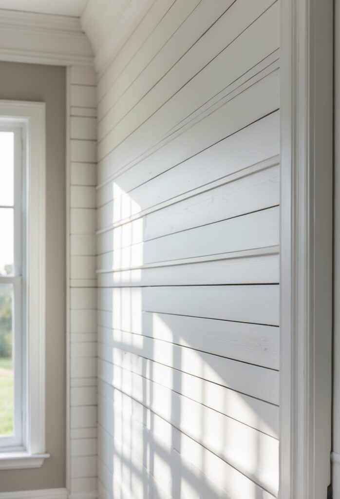 Farmhouse-style shiplap paneling adds texture and warmth to walls with its clean, linear look. It fits well in both traditional and modern home designs. The boards interlock tightly, giving walls a neat and timeless appearance. This style is popular for creating cozy, inviting spaces. See more farmhouse shiplap ideas.