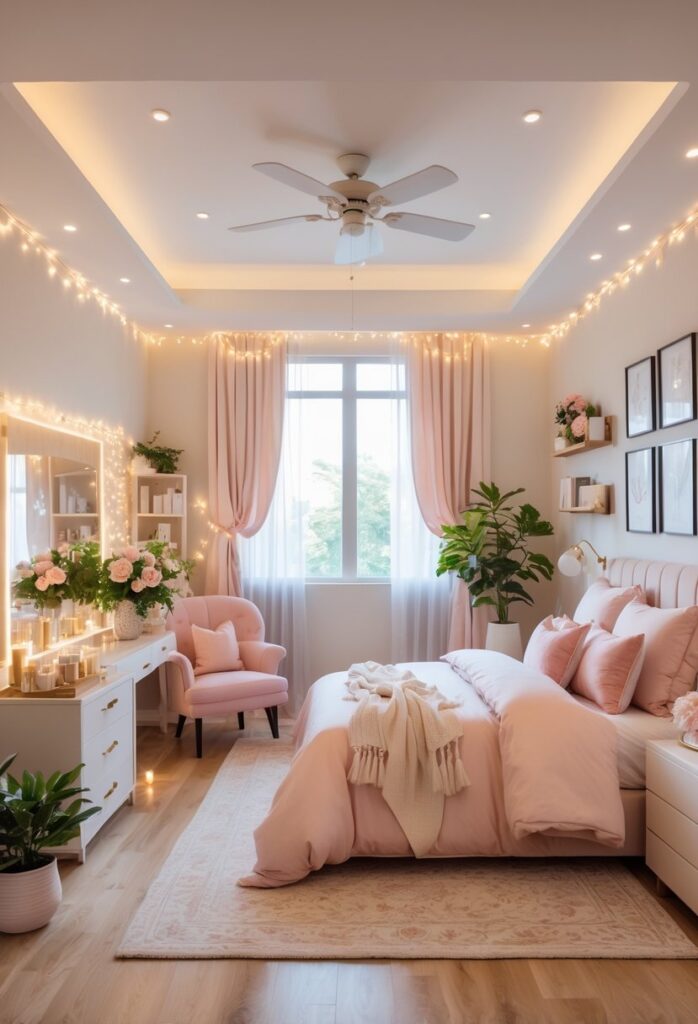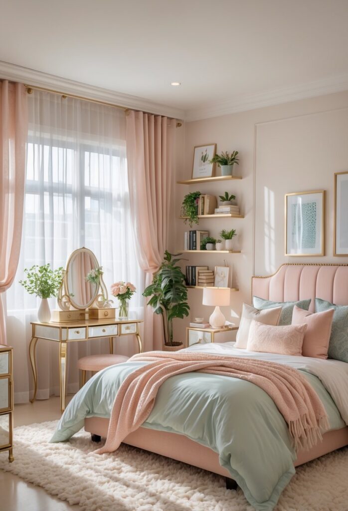 This shade pairs well with white or cream bedding, making the room feel light and elegant. Adding gold or metallic accents enhances the feminine vibe.