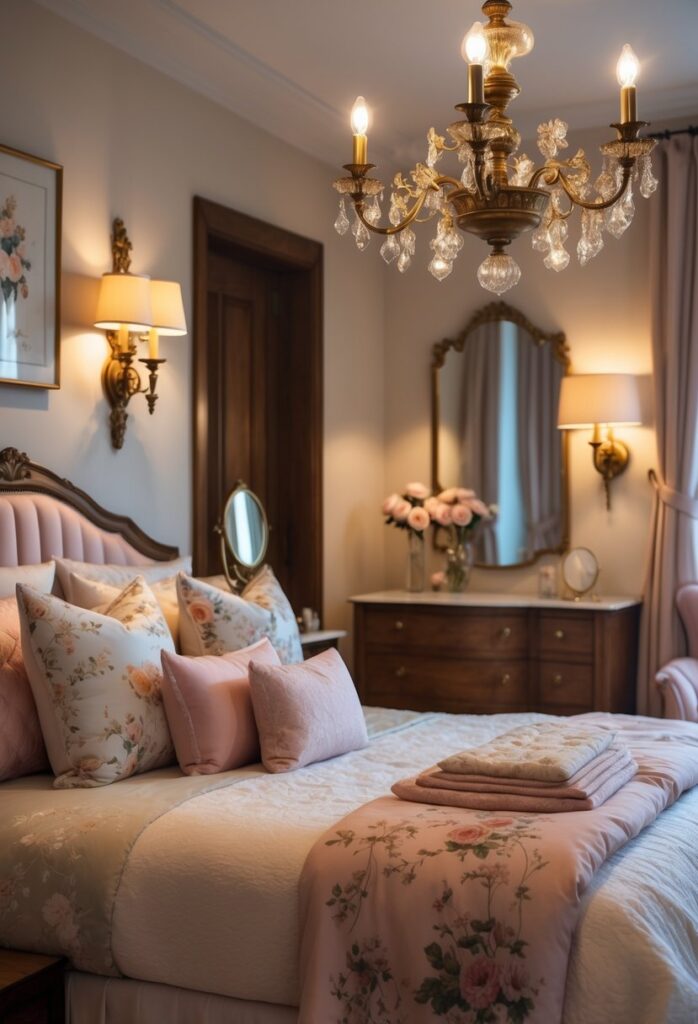 Vintage brass light fixtures add a warm, classic touch to any bedroom. Their soft golden tones create a cozy, inviting atmosphere.