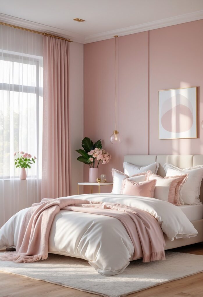 Using a blush pink wall behind the bed offers a subtle focal point. It brightens the space while maintaining a calm, stylish look. More ideas can be found at 12 Stunning Pink Accent Walls and Bold Bedroom Ideas.