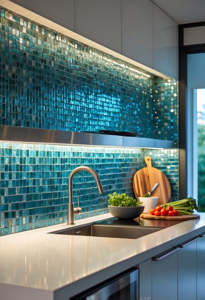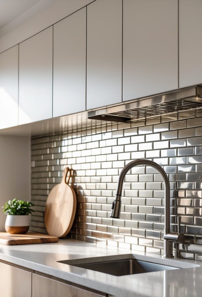 Metallic tile accents add a modern touch to kitchen backsplashes. They reflect light well, brightening the space.