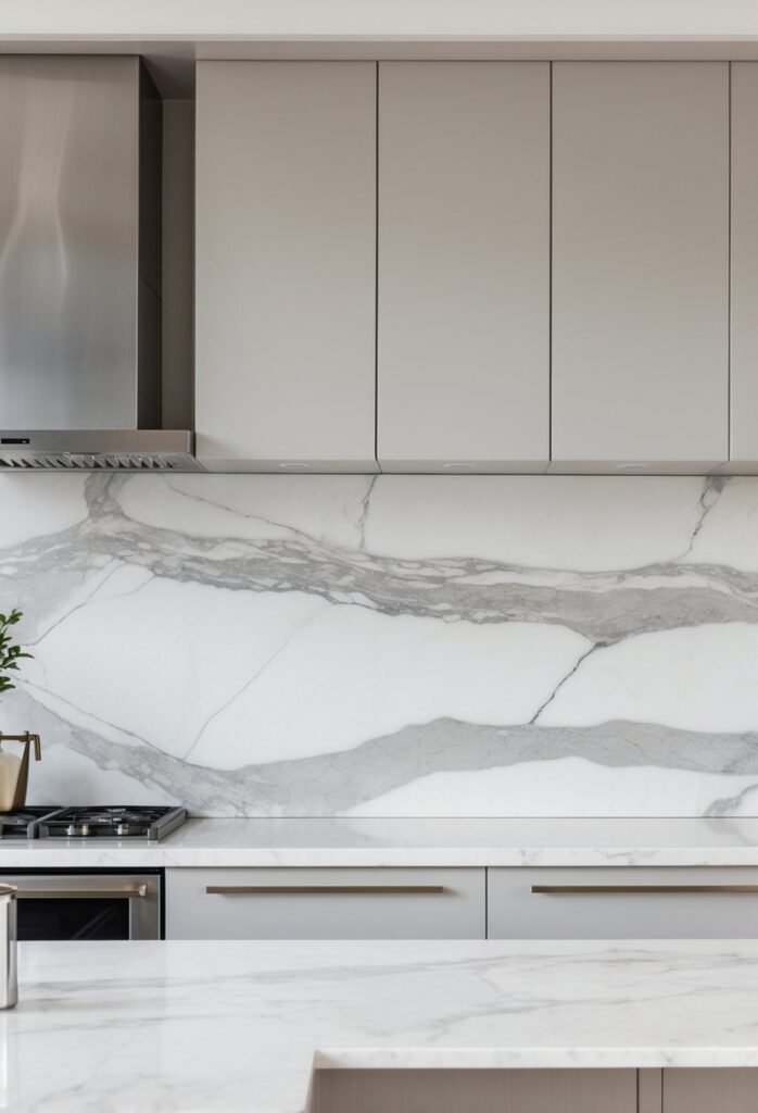 A marble slab backsplash offers a sleek and seamless look. It covers a large area without grout lines, making the surface easier to clean.