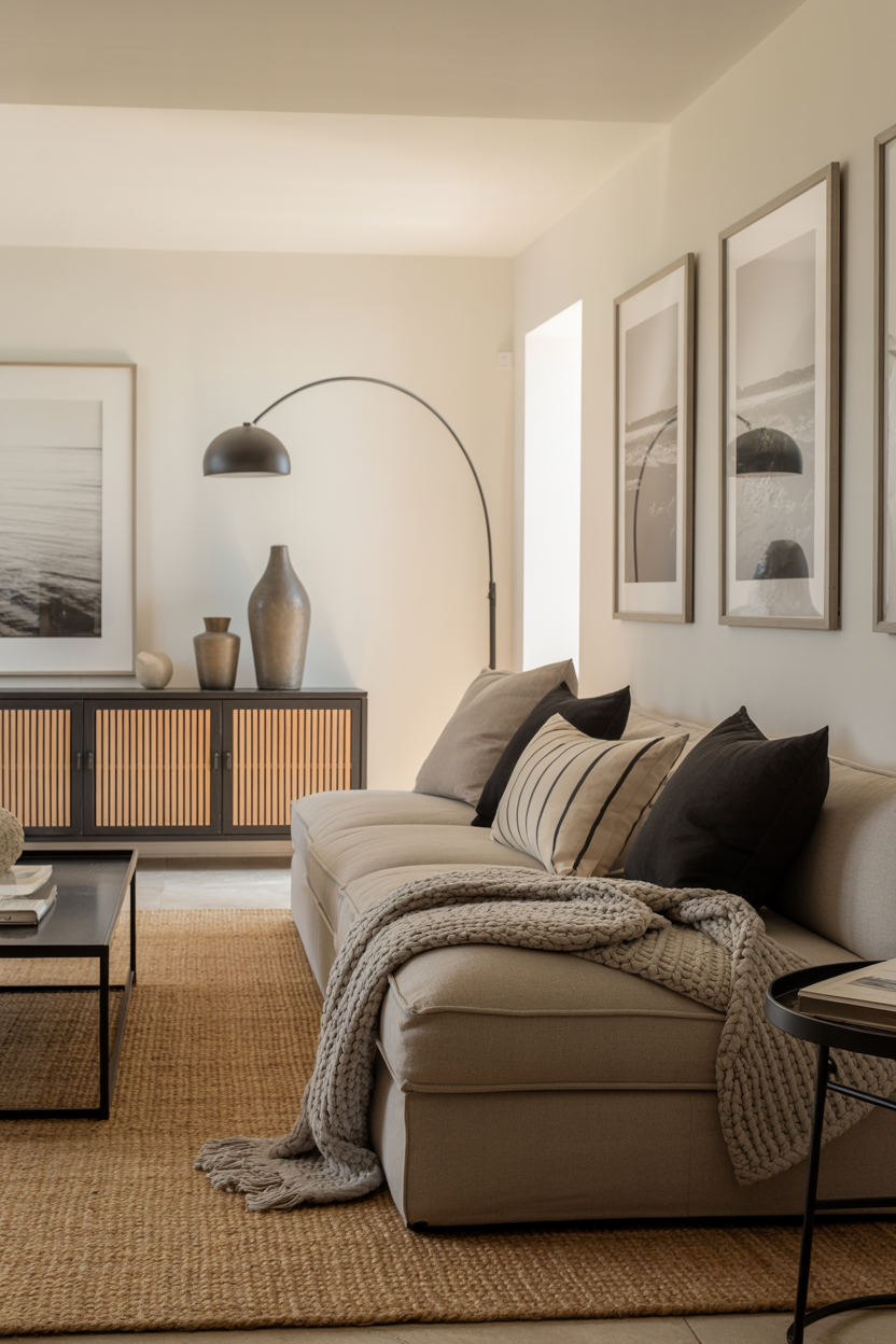 Your sofa is a long, low silhouette in stone-gray performance linen, anchored by striped throw pillows in black and oat. Layer in black-and-white coastal photography and a few touchable textures—chunky knit throws, ceramic vases, and a slatted wood media console with black pulls. The result is modern, unfussy, and still totally beachy.