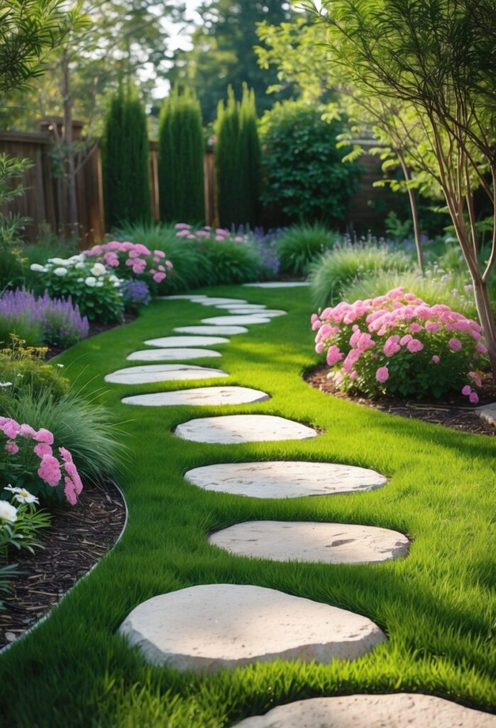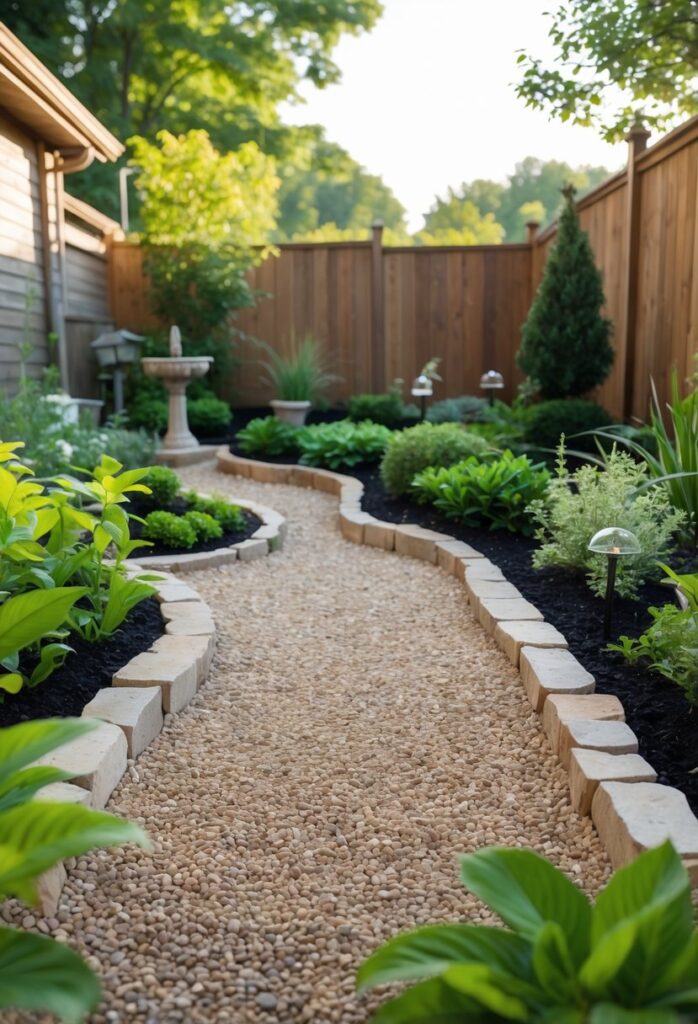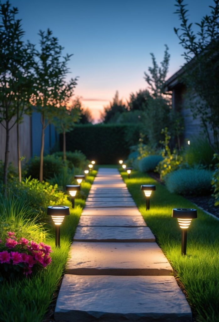 A pathway lined with solar garden lights adds both safety and style to any backyard. These lights charge during the day and automatically turn on at night, providing soft illumination without the need for wiring.