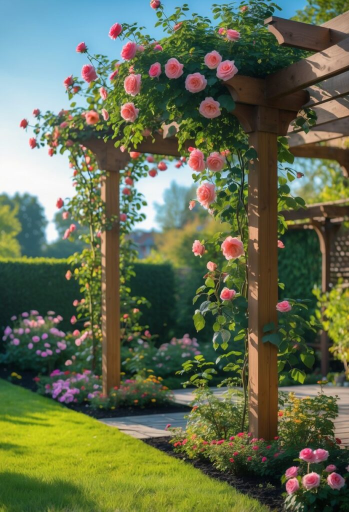 Choosing sturdy wood like cedar or redwood helps the pergola last longer. Climbing roses thrive best when planted at the base, where their roots can get plenty of nutrients and water. The vines slowly cover the pergola, giving the space a romantic and peaceful feel.