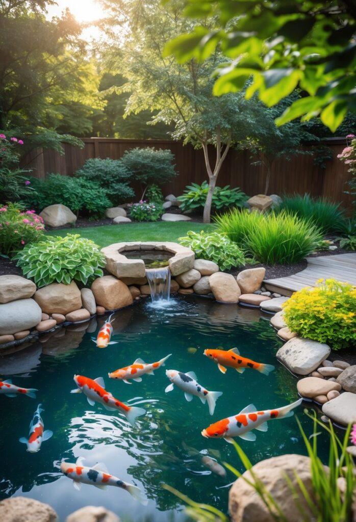 The pond can be designed with natural stones, water lilies, and small waterfalls. These elements help keep the water clean and provide a healthy environment for the fish.