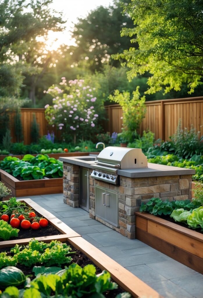 An outdoor kitchen paired with a vegetable garden offers fresh ingredients right at hand. This setup makes cooking more convenient and encourages healthy eating.