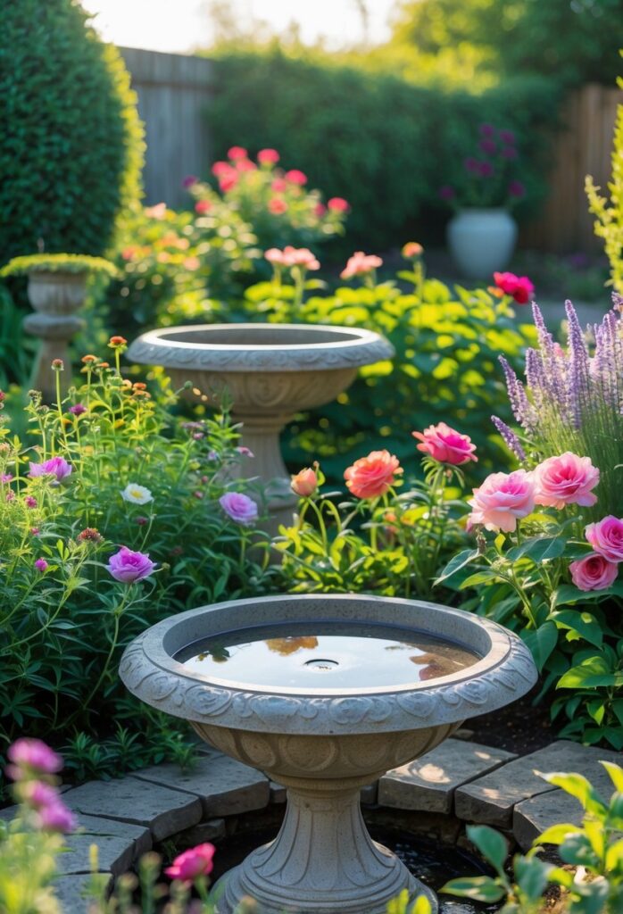 Placing a bird bath near flowers also supports pollinators. Bees and butterflies visit the plants, increasing garden activity. This mix benefits the local ecosystem by providing water and food for wildlife.