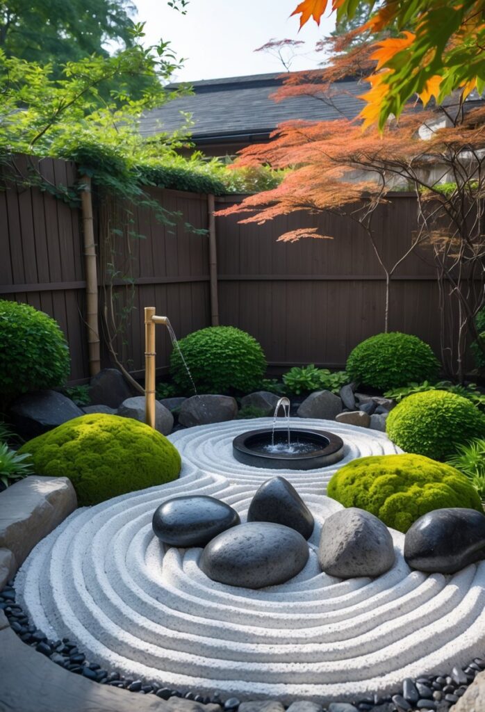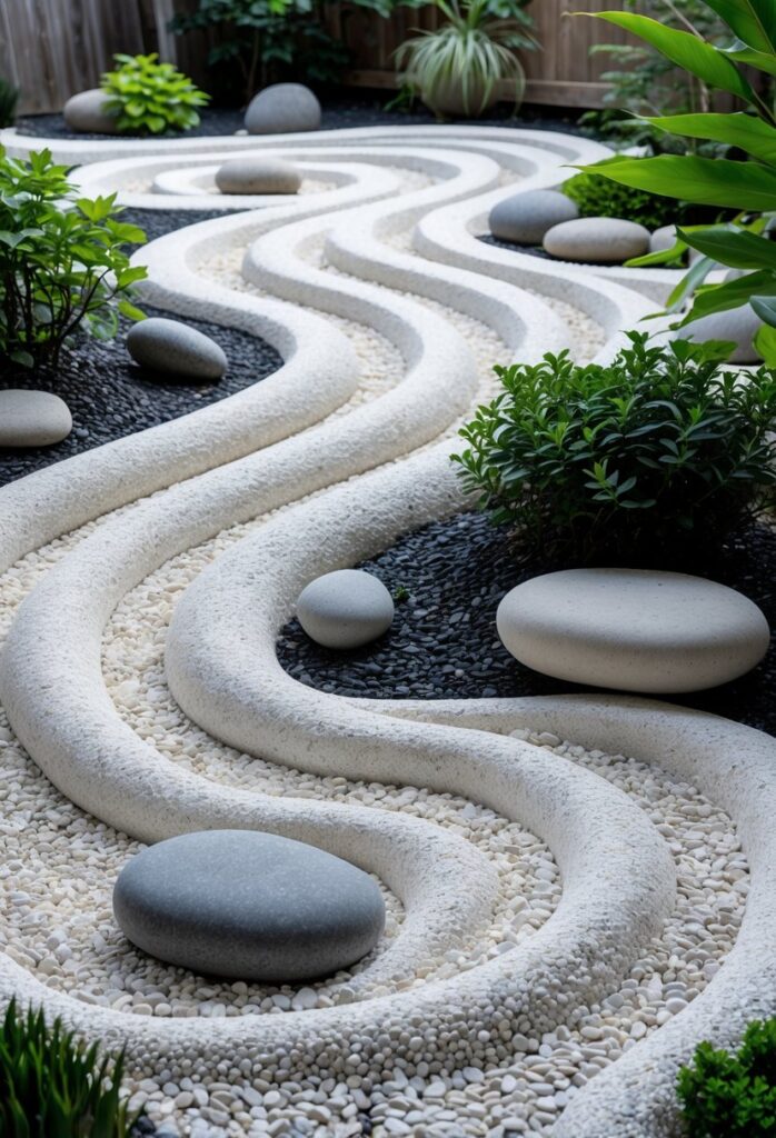 Gravel is often raked into patterns that look like flowing water. The rocks are carefully placed to create a natural, peaceful feeling. Small plants such as moss or low shrubs add soft green touches without overwhelming the space.