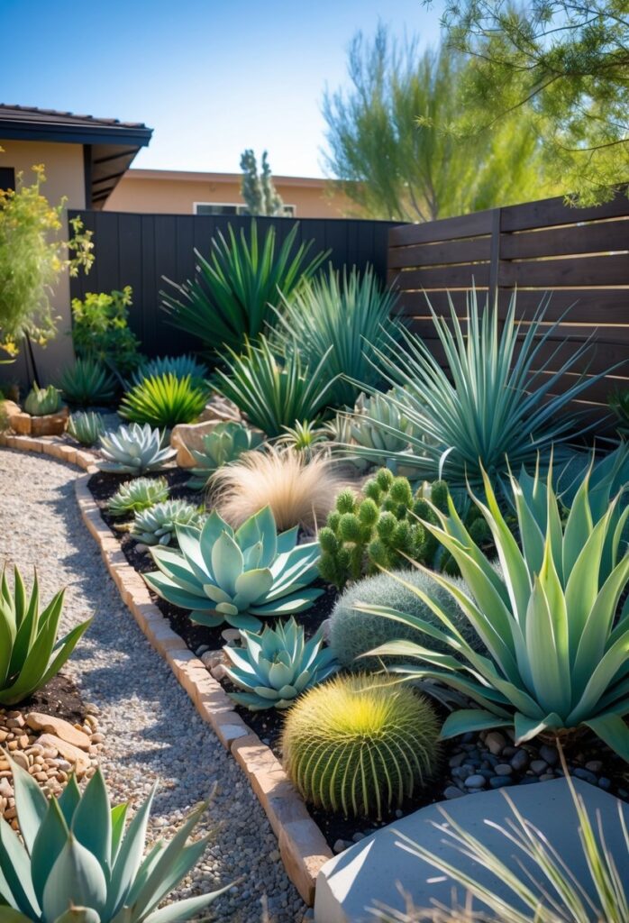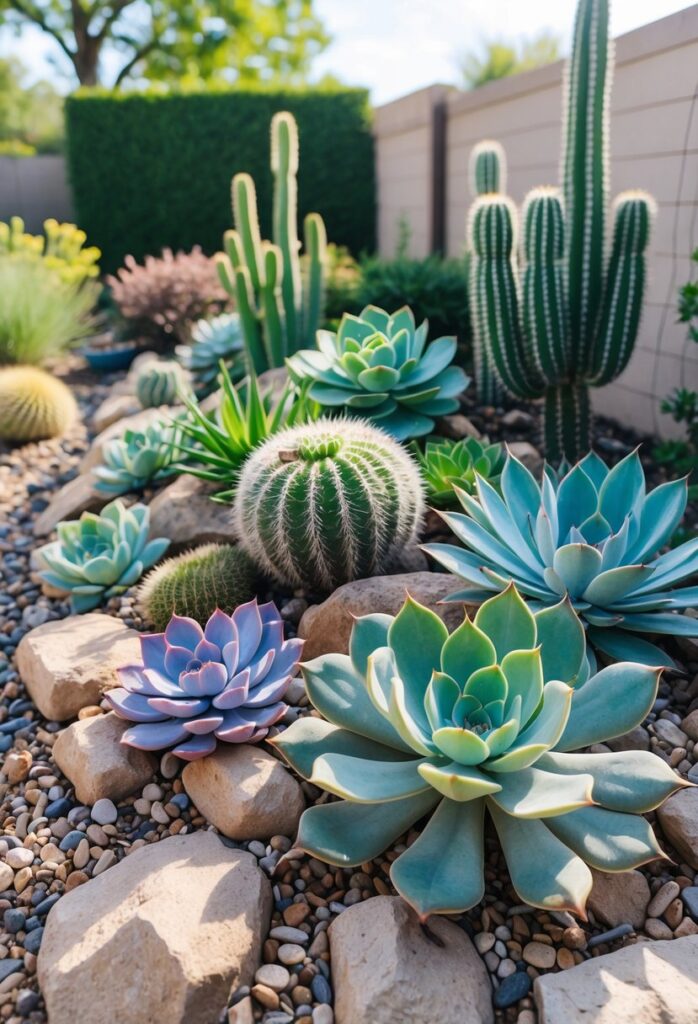 A succulent and cactus rock bed is a practical way to add texture and color to a backyard. These plants need little water and do well in sunny spots with good drainage. Combining them with rocks helps keep soil stable and reduces the need for frequent watering.