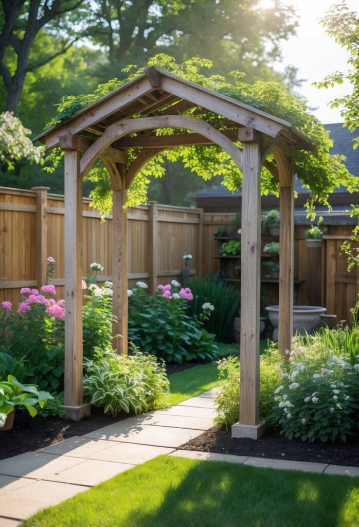 A wooden arbor also brings a vintage or countryside feel. Weathered wood with natural textures enhances this effect. This type of garden feature can turn an empty space into a welcoming area.