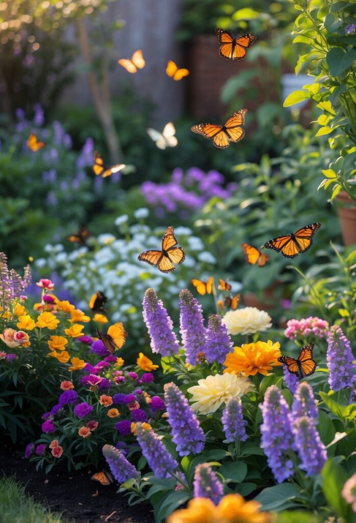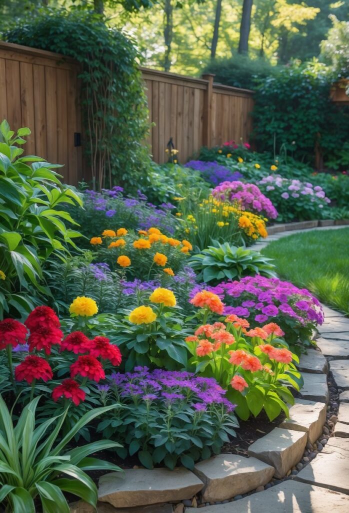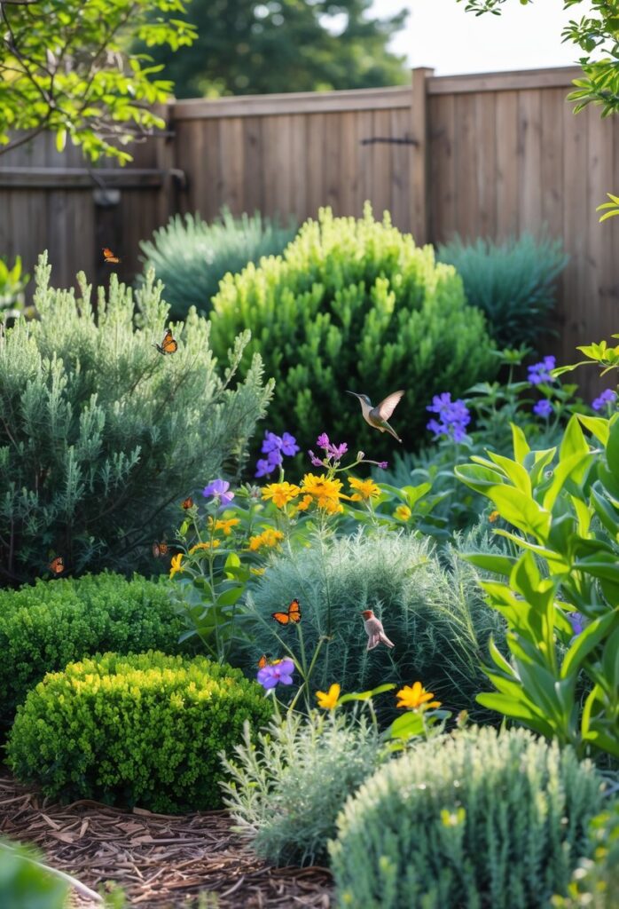 Choosing flowering plants that bloom at different times keeps the area interesting year-round. Bright flowers like Mexican Sunflowers or Daylilies attract a variety of colorful birds. Using drought-tolerant plants such as Salvia helps the garden stay healthy with less water.