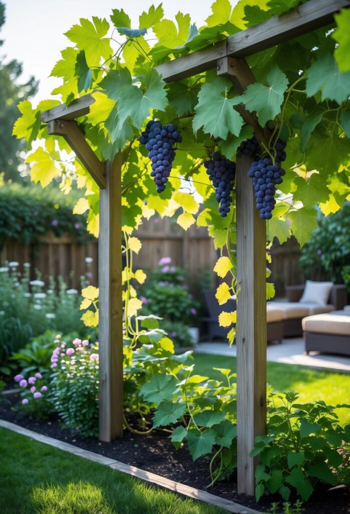 A pergola with climbing roses adds both beauty and structure to a backyard garden. The wooden beams provide a strong frame for rose vines to grow upward, creating a natural canopy. This canopy offers light shade while showcasing delicate rose blooms.