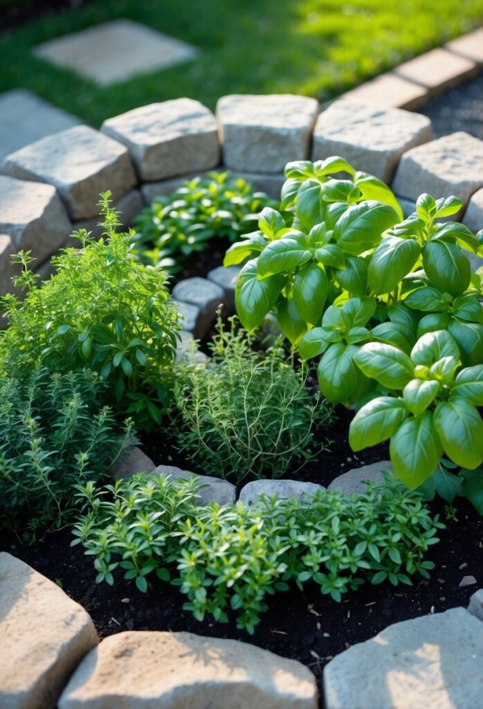 Thyme likes dry, sunny spots. Placing it near the top of the spiral ensures good drainage and plenty of sunlight. Basil, on the other hand, prefers moist soil. Planting it near the base where water collects keeps it healthy and strong.