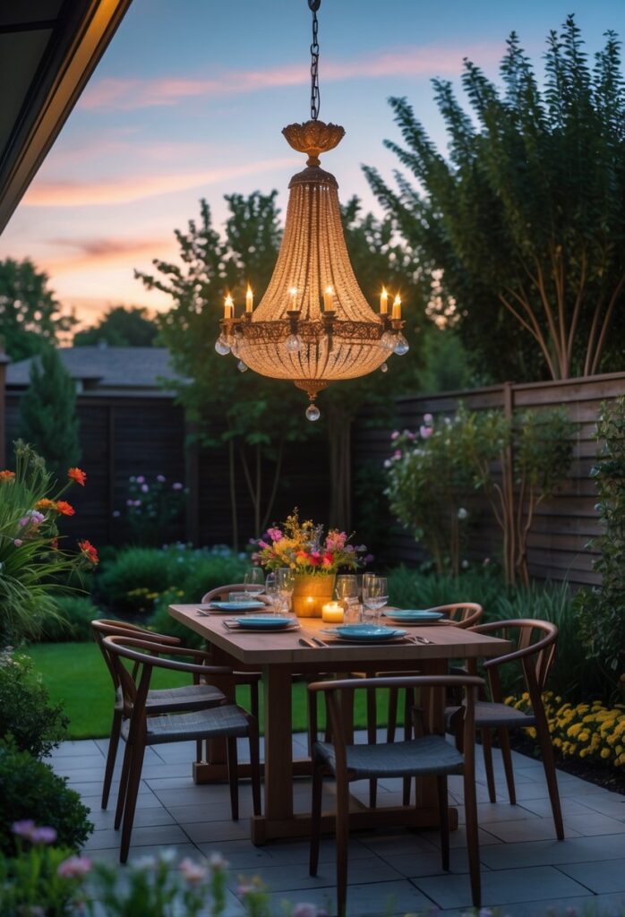 An outdoor chandelier over a dining area adds both light and style to a backyard space. It creates a central focal point that enhances the dining experience. This type of lighting can make evening meals feel more inviting and comfortable.