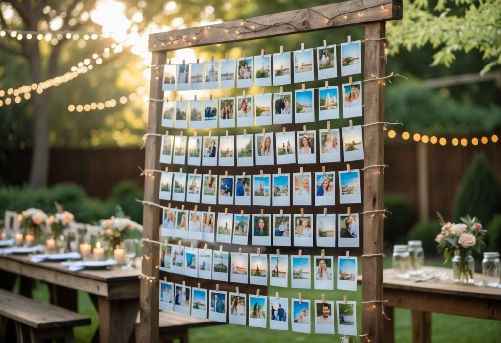 A DIY photo wall using Polaroid snapshots is a simple and personal way to decorate a backyard wedding. Guests can take instant photos during the event and pin them to a designated wall or board. This creates a live gallery of memories from the day.