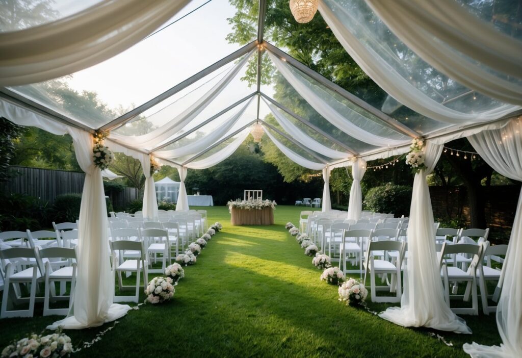 Sheer drapes also work well to soften the tent’s structure. They hide poles and frames, making the space look more polished and inviting. This style is popular for backyard weddings that want to balance elegance with nature’s beauty.