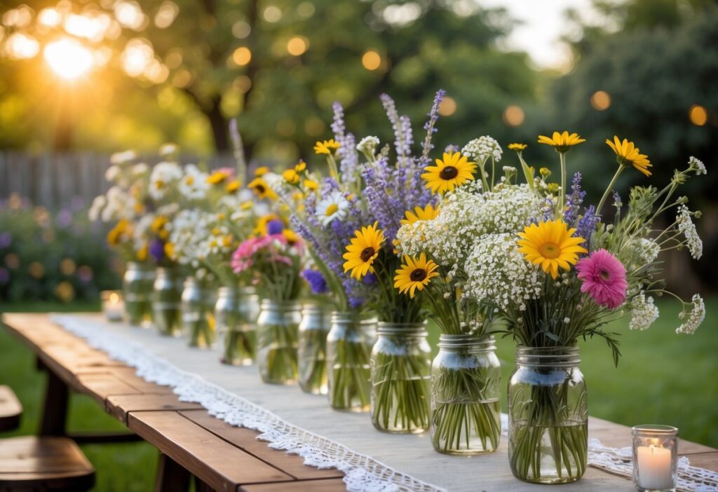 Mason jars work well as simple, budget-friendly centerpieces for backyard weddings. They can be filled with a mix of colorful wildflowers like daisies, lavender, and baby’s breath. This creates a natural, fresh look that fits a rustic or casual setting.