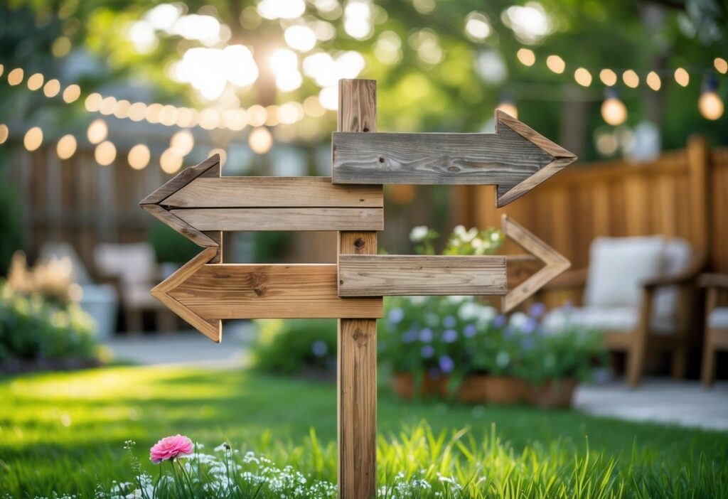 Personalized wooden signs help guests find their way easily during a backyard wedding. They clearly point to key spots like the ceremony area, reception, restrooms, and parking.
