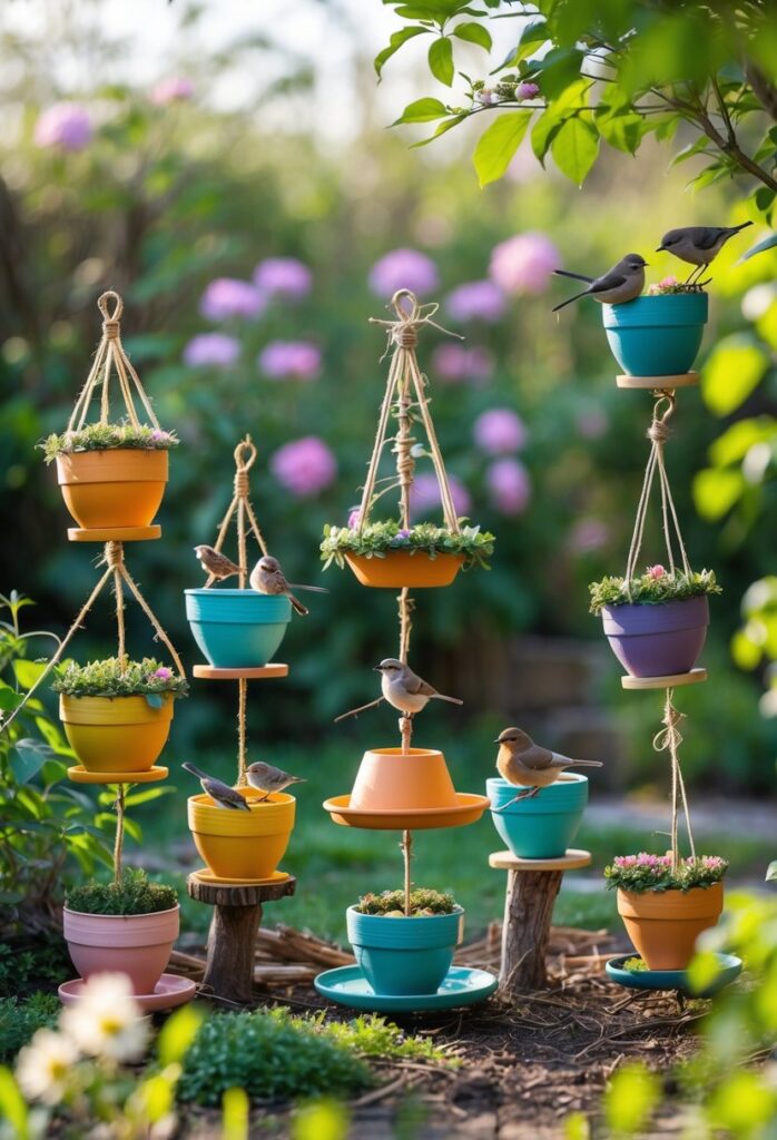 This design is easy to customize. Adding some drainage holes helps prevent water buildup in the seed area. Using recycled pots and saucers makes this project budget-friendly and eco-friendly.