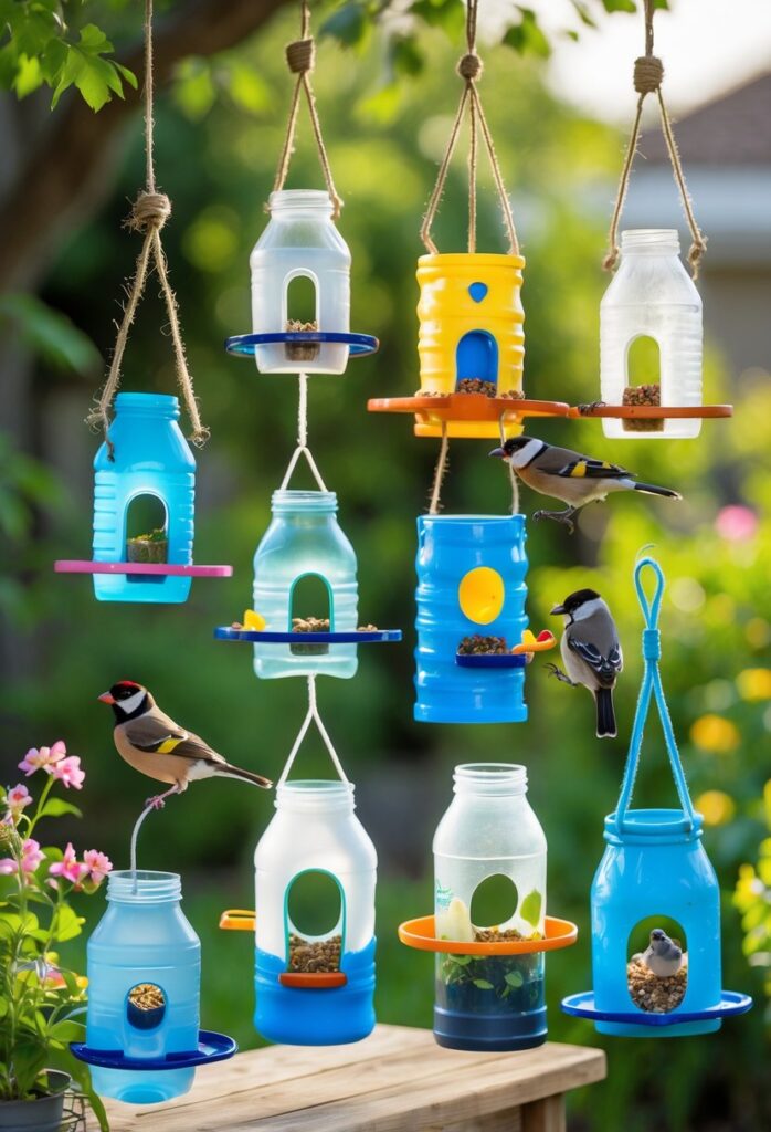 Creative feeders include a hanging pinecone coated with peanut butter, a flower pot feeder, and a recycled milk jug feeder. These use simple household items and provide unique feeding spots for birds.