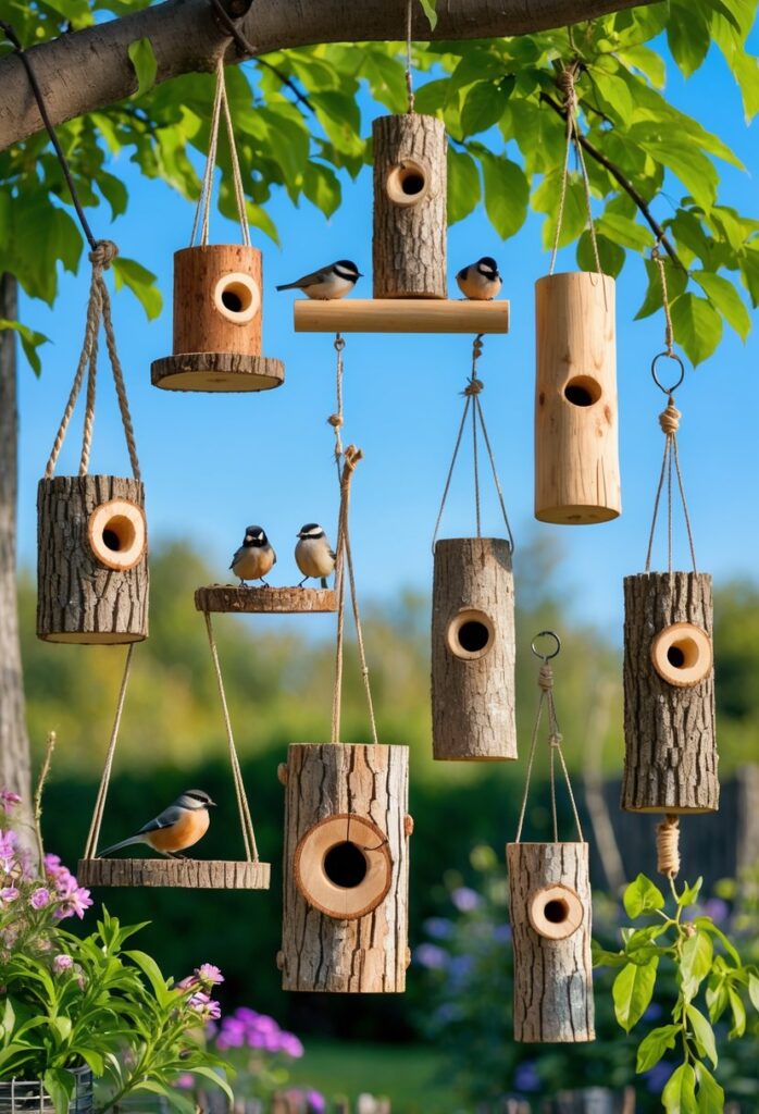 Making a hanging log feeder can be quick and inexpensive. Many use recycled wood or fallen branches. With some drilling and cutting, the log becomes a functional bird feeder.