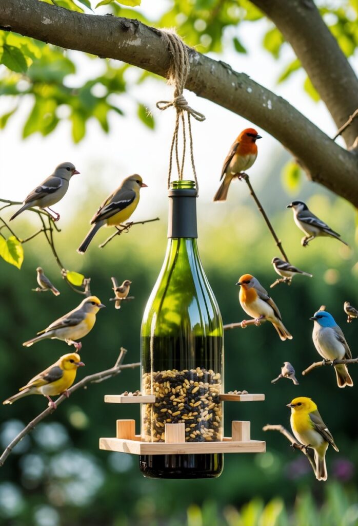 A wine bottle bird feeder is a simple and eco-friendly way to attract birds. It reuses empty bottles by turning them into a container for bird seeds. This feeder can be hung in a garden or on a balcony.