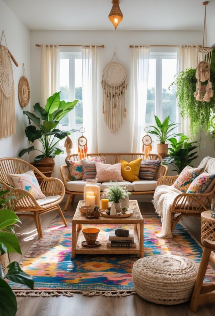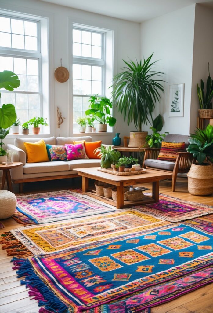 Patterned rugs anchor a boho living room and add visual interest. Bold geometric designs or colorful prints work well in this style.