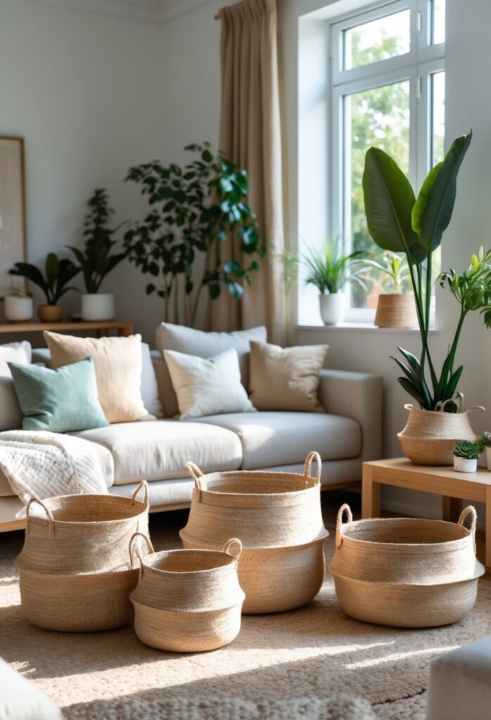 These woven pieces blend rustic charm with organization. Place them near seating areas or shelves for easy access.