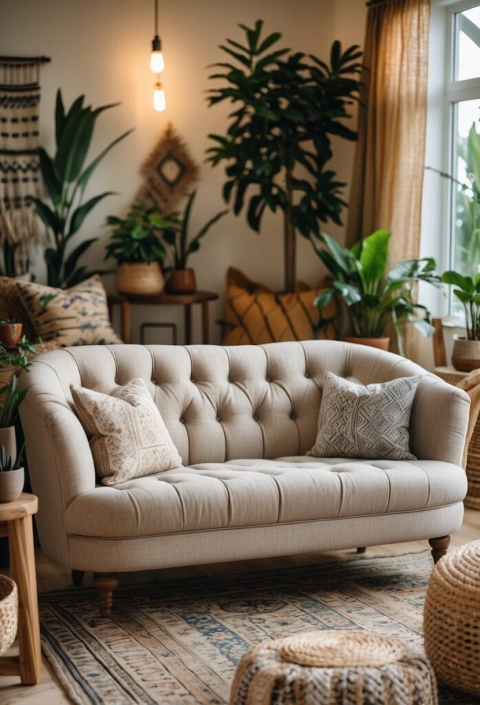 A tufted loveseat brings elegant texture to a boho living room. The button-tufted design adds depth without overwhelming the space.