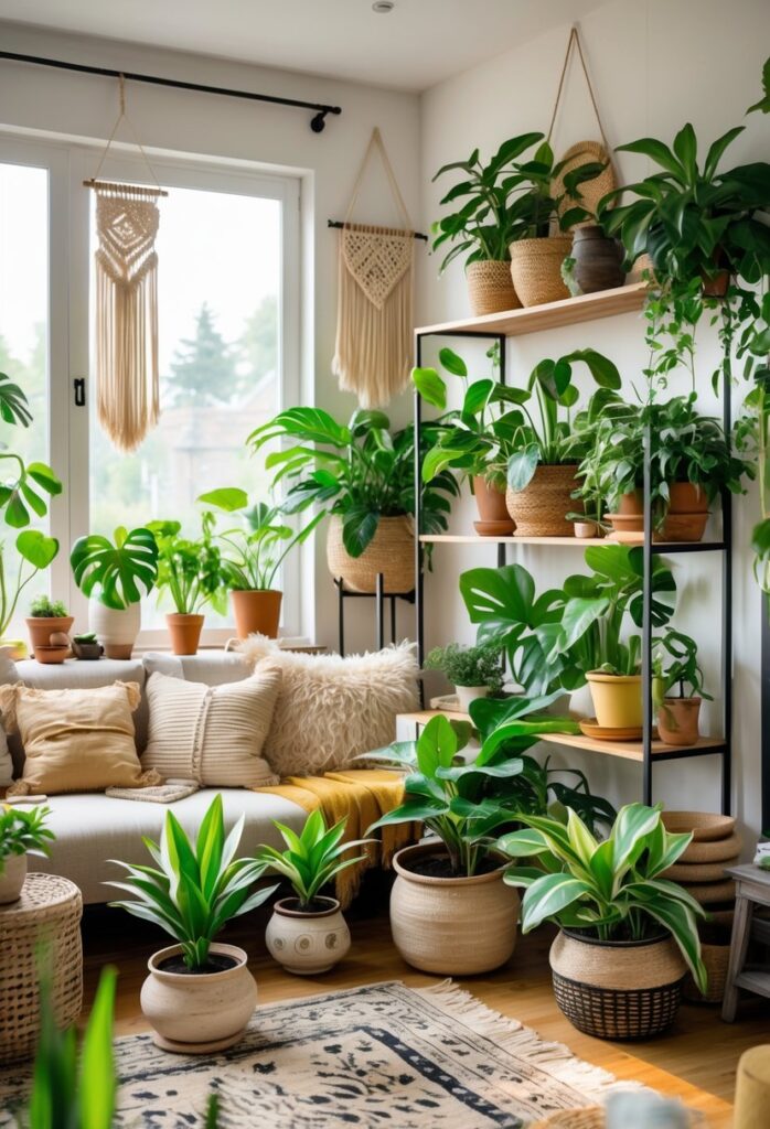 Plants add life and energy to a boho living room. Mix different varieties like trailing pothos, tall monstera, or small cacti in varied pots. Arrange them at different heights using stands, shelves, or hanging planters to create visual interest and natural texture.