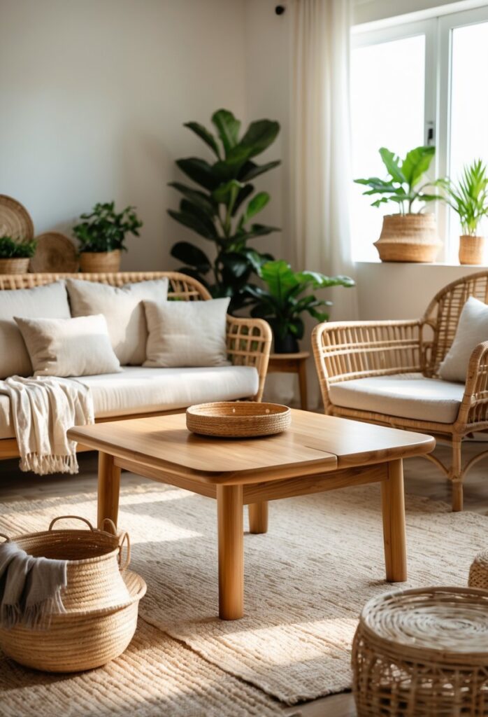 Natural wood pieces like reclaimed coffee tables create an earthy base for boho style. Woven accents such as jute rugs and rattan baskets add texture and warmth. These materials work together to bring organic beauty into the space.