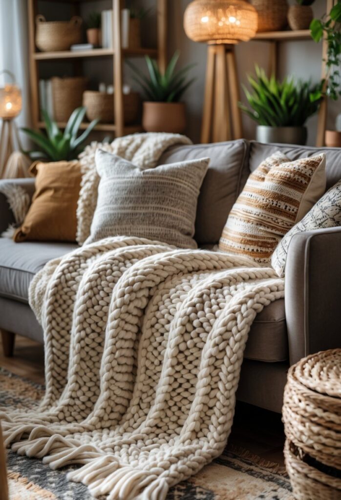 Chunky knit blankets bring warmth and texture to boho living rooms. Their oversized weave creates visual interest while keeping spaces cozy.