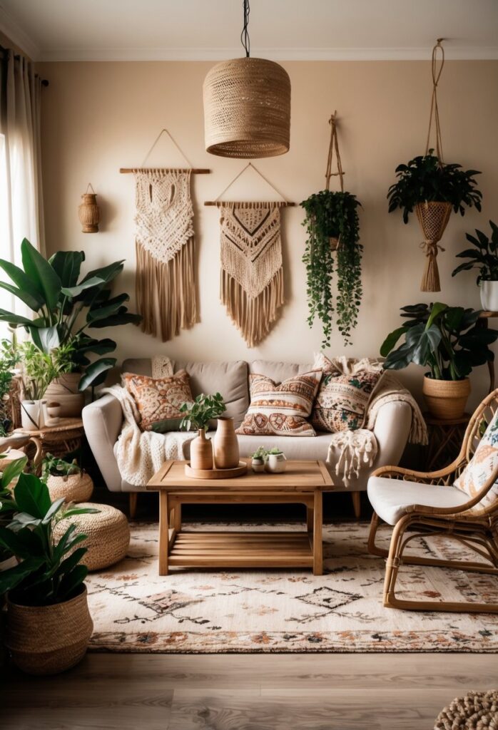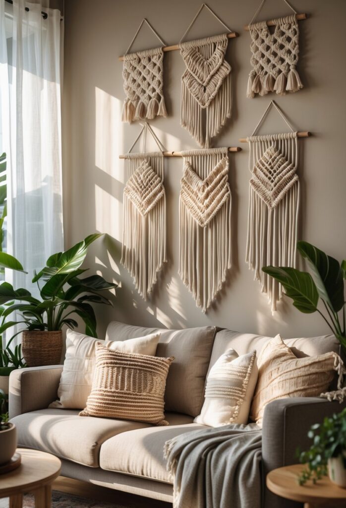 Hanging multiple macrame pieces at different heights creates visual depth in a boho living room. The textured knots and woven patterns add warmth to walls above sofas or beds.