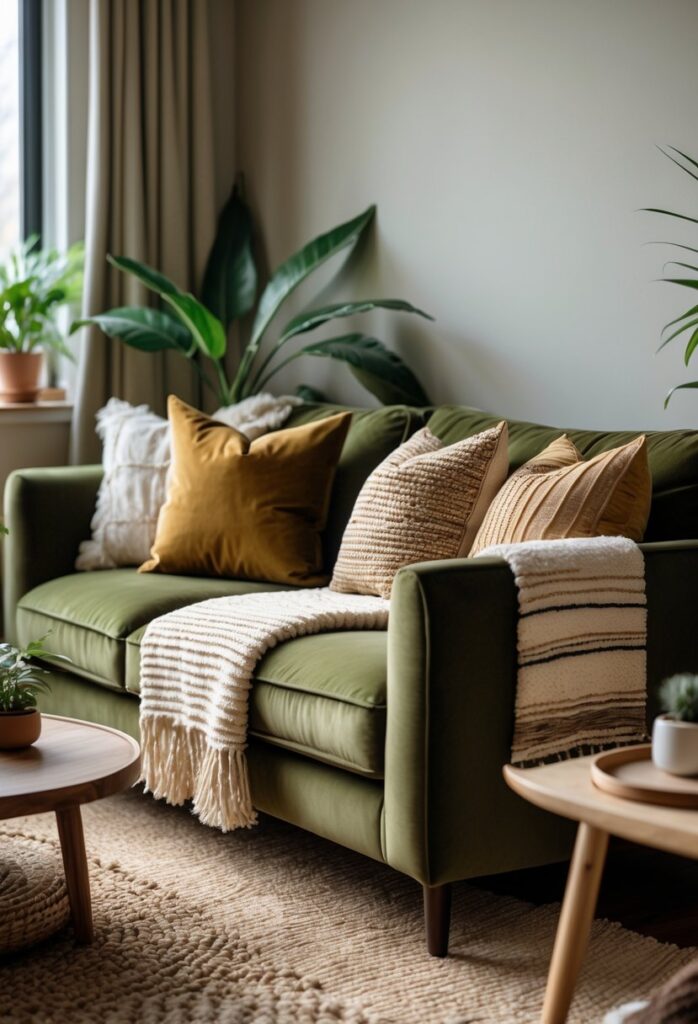 1) Incorporate a plush olive green sofa with mixed textured pillows