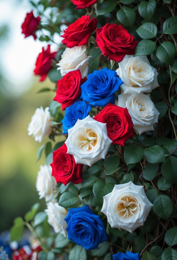 The Fourth of July Climbing Rose is known for its vibrant red and white striped flowers. It blooms continuously during the summer, providing a long season of color in the garden. This rose can grow between 10 and 14 feet tall, making it ideal for covering walls, trellises, or fences.