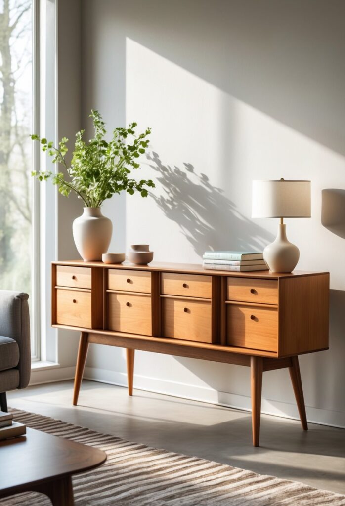 In a living room, a console table works well behind a sofa or against an empty wall. It creates a boundary between spaces while offering surface area for lamps, framed photos, or decor pieces. The height should match or be slightly lower than the sofa back to keep balance.