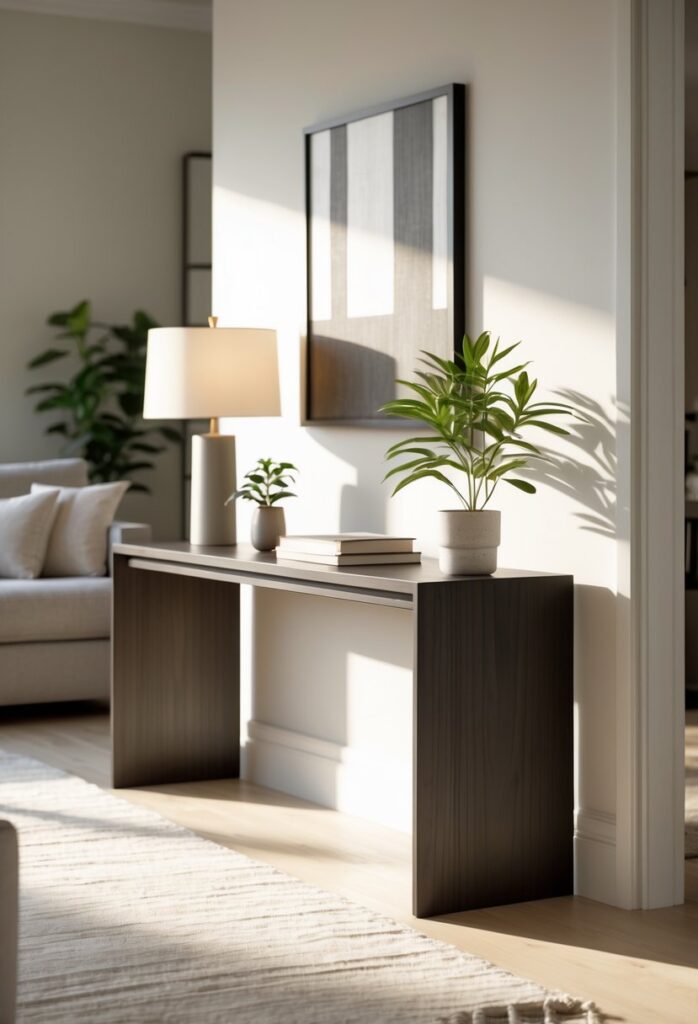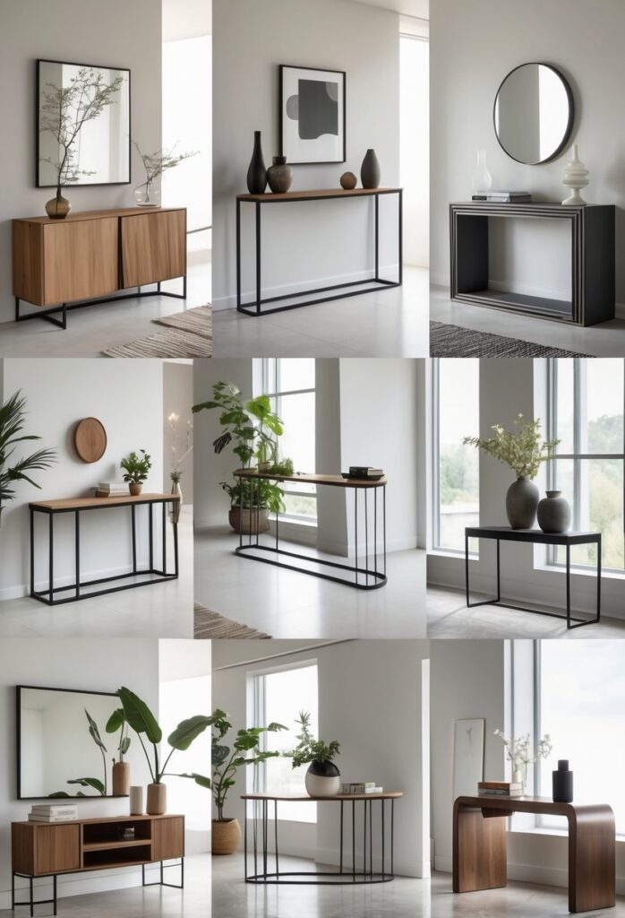 In an entryway, console tables provide a landing spot for keys, mail, and small personal items. Positioning the table close to the door but not blocking traffic flow is important. The table should be sturdy and sized for the space, usually narrow and long.