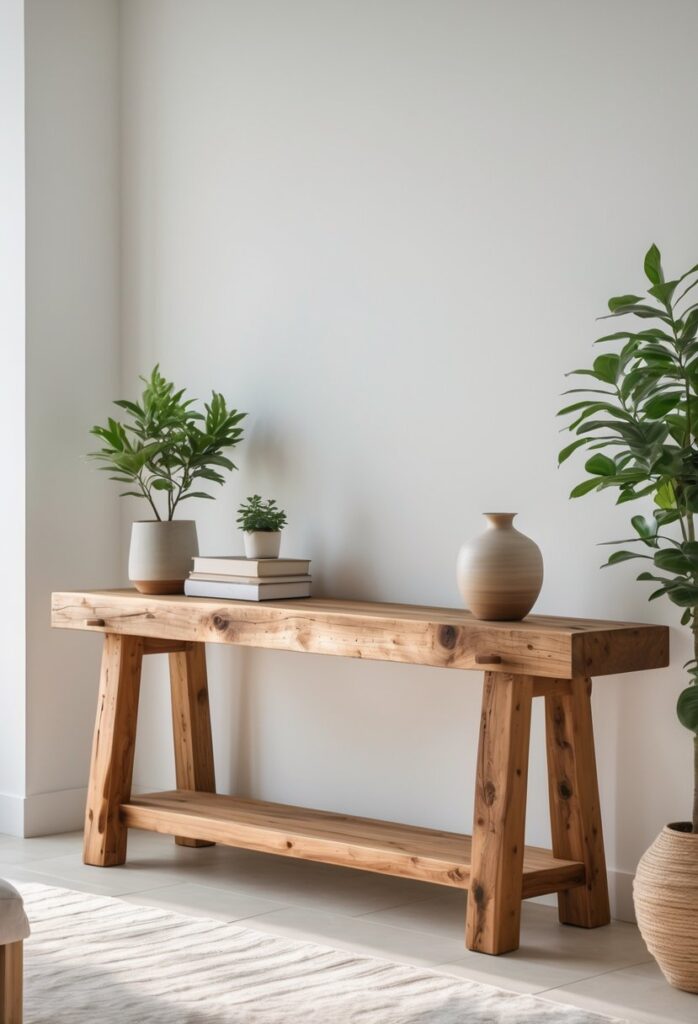 The Wayfair rustic wood console table offers a simple, natural look. It often features solid wood with visible knots and grain patterns.