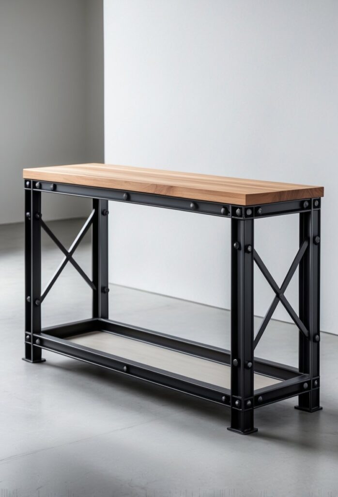 The Amazon Rivet Industrial Metal Console combines a solid metal frame with a durable wood top. It measures about 47 by 16 inches, fitting well in narrow spaces.