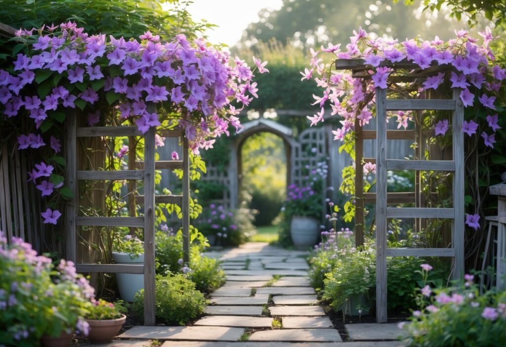 Climbing clematis vines add charm and height to a cottage garden. They produce colorful flowers that create a soft, romantic look. Using a trellis helps the vines grow upward, saving space and adding vertical interest.
